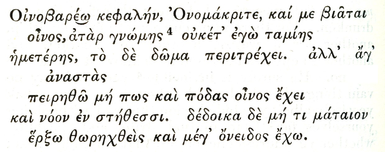 ![]() A picnic with flute music. One of many whimsical illustrations hand painted in my copy of Poets of the Greek Anthology, translated by F.A. Wright, London, 1924, by a former owner, whose talents, alas, remain anonymous. Time to celebrateHappy New Year! The year's end is a time of celebration — Christmas, Hanukkah, New Year's, the Winter Solstice. The sun pauses, and turns back in the sky, the beginning of winter in the Northern Hemisphere, of summer in the Southern half. There are family get-togethers, parties at social clubs, office parties for workers, as well as religious rituals. There are fireworks and much merry drinking. As we race down the Appian Way in our chariots, we are urged to have a designated charioteer. This month we offer some rueful couplets from an ancient Greek poet, Theognis of Megara. Theognis on how to live your lifeTheognis lived, it is thought, in the sixth century B.C. Little is known of his life. In fact we are not even sure which "Megara" he was from. He is most commonly thought to have been born in Attic Megara, a city which was (and is) located in the south west corner of Attica, on the Isthmus of Corinth, on the road from Athens to the Peloponnese. A rival theory placed him in the colony of Megara Hyblaea, in Sicily. His surviving poetry is a large collection of aphoristic verses, much of it moralizing, written in the elegiac meter, with each line of hexameter in the epic style followed by a shorter line. The tone is reminiscent of Hesiod's Works and Days, but Theognis' Elegies lack the structural coherence of Hesiod's work. Where Hesiod's Old Farmer's Almanac tied a series of entertaining myths (including Prometheus and Pandora) to the seasons of the year, Theognis' couplets jump from topic to topic in no particular order. He discusses subjects such as friendship, wealth, poverty, and marriage, then revisits favorite topics multiple times. Some have questioned whether the collection is by one author. The room is spinning around!A number of Theognis' verses have to do with wine, a good thing in moderation, bad in excess, a concept boiled down in the following couplet (ll. 211-212): Oinon toi pinein poulun kakon; ên de tis auton But Theognis was apparently familiar with the effects of overindulging. In a longer set of verses (503-508), he describes the sensations: the room spins around (peritrekhei "runs around"); he will stand up to see if the wine affects his ability to walk (podas oinos ekhei "the wine possesses my feet") — any bets on that? Above all, he is afraid he will do something stupid (mataion) and be embarassed (meg' oneidos ekho "I [will] have great shame"). The verses are addressed to Onomacritus, otherwise unknown. Below, in Greek and English, is Theognis' description of his experience with too much booze.